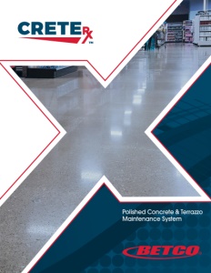 ©2021 Betco Corporation All Rights Reserved. 400 Van Camp Road Bowling Green, Ohio 43402 Item #92390-92 11/2021 Crete Rx™ CM30 Crete Rx™ Concrete Stain Removal Kit E29805-00 92411-00 • Designed for maintaining pre-polished concrete floors • Three counter- rotating, high RPM satellite tool drivers • Aggressive, 330 lb down pressure • Smaller, lighter- weight for easier maneuverability and transport • Safe, EPA / CARB certified emissions • 6 Qts LiquiGrind, 4 Qts Densifier, 2 Qts Stain Defense • Combines all Crete Rx Polishing System products into one convenient place • Ideal for stain remediation projects 1 / skid 12 variety Qts/cs Concrete & Terrazzo Maintainer Ready-To-Use Quarts of Crete Rx Products Productivity Rate: Up to 2,250 sq.ft. /hr Sealant Infused (SI) Cleaning and Burnishing Pads • Continuously fill porous concrete with advanced resin polymers deep into the concrete pores • Provides excellent protection and deep gloss without topical coatings Coverage Rate: 200,000 sq.ft. /pad - SI Cleaning Pads 11″ SI Cleaning E84111 5/cs 12″ SI Cleaning E84112 5/cs 13″ SI Cleaning E84113 5/cs 14″ SI Cleaning E84114 5/cs 15″ SI Cleaning E84115 5/cs 16″ SI Cleaning E84116 5/cs 17″ SI Cleaning E84117 5/cs 20″ SI Cleaning E84120 5/cs 14″ x 20″ Cleaning E84109 5/cs 14″ x 28″ Cleaning E84108 5/cs SI Burnishing Pads 21″ SI Burnishing E84121 5/cs 24″ SI Burnishing E84124 5/cs 27″ SI Burnishing E84127 2/cs